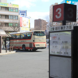 左側にある緑の矢印が示すバス停No.3が八幡平行きです。