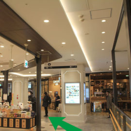 北口の右側にあるエスカレーターを使って下に降ります。1階に下りて左に向かいます。