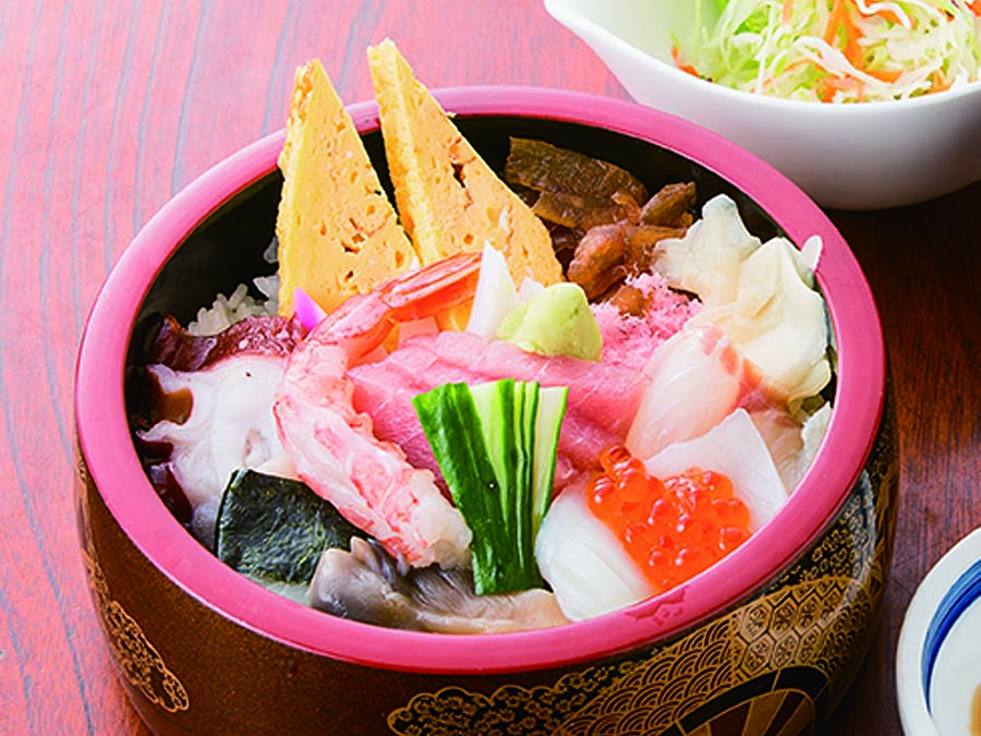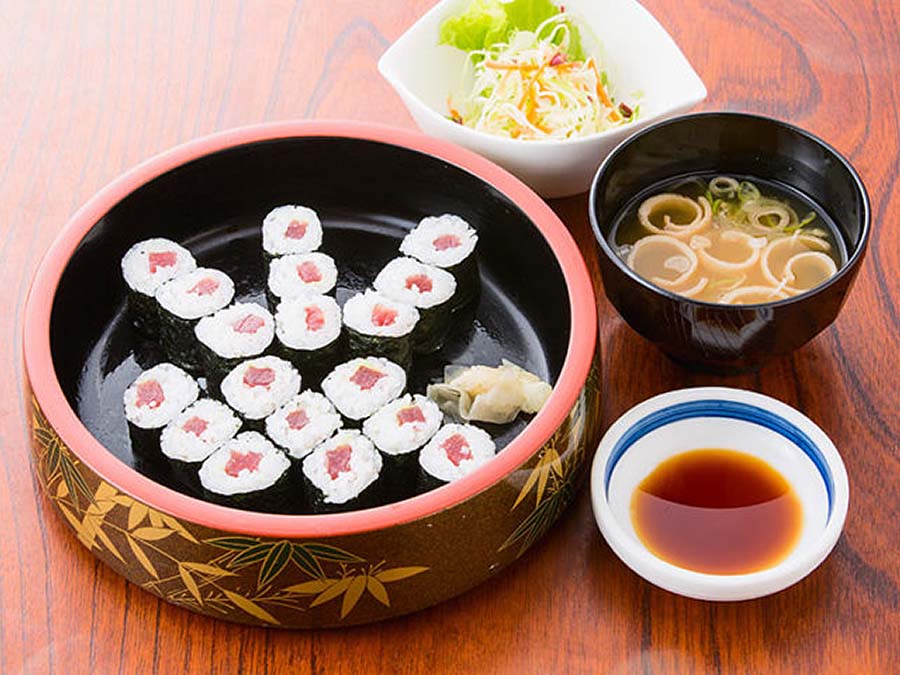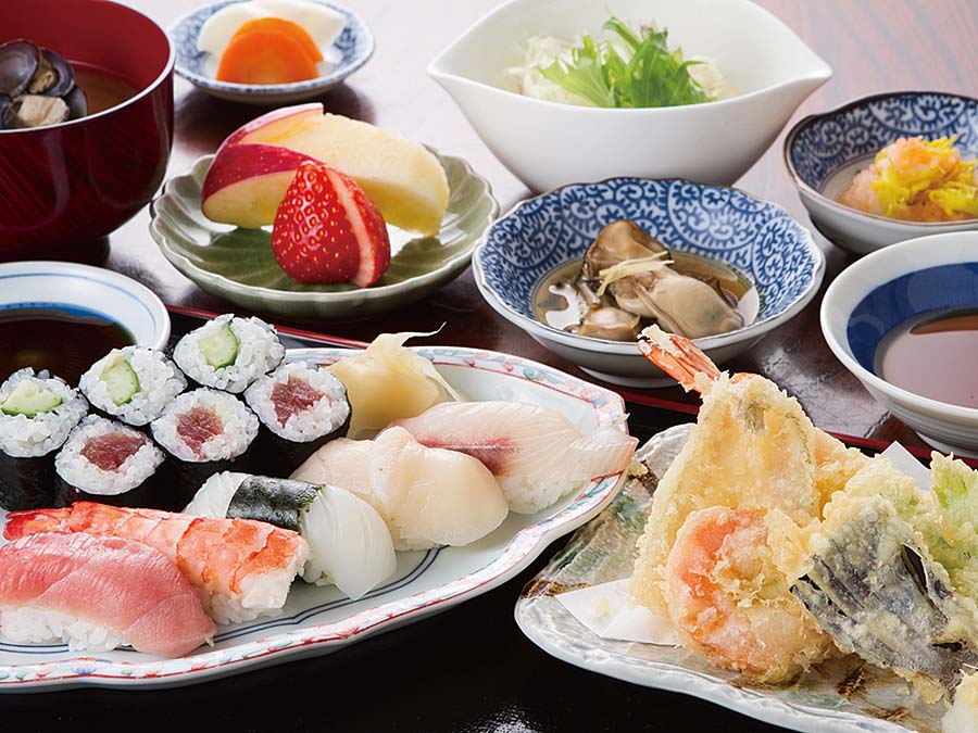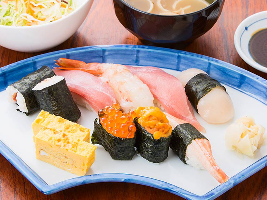 Our recommended menu item is the "Nigiri Sushi and Soba Set." This set menu, popular with people of all ages, features five kinds of sushi toppings (tuna, steamed shrimp, scallop, surf clam, and sea bream) and warm soba noodles.