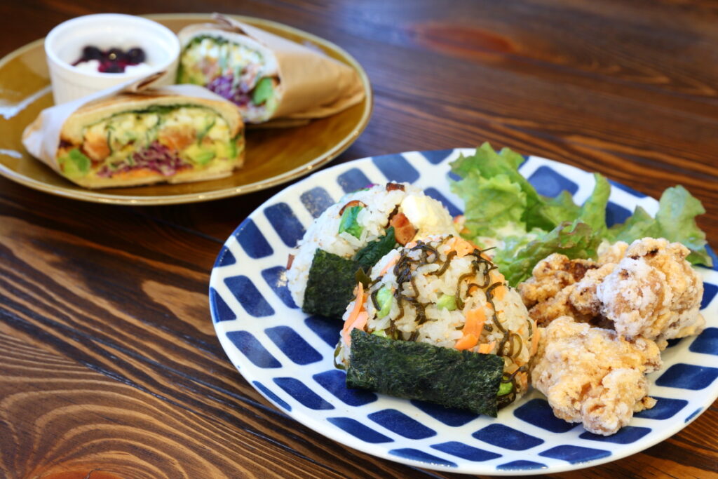 I recommend the "Onigiri Plate." It's a plate that comes with your choice of onigiri plus salt koji fried chicken. The onigiri is made with rice flavored with grilled flying fish broth and filled with plenty of ingredients. The onigiri varieties include salmon, edamame and salted kelp; grilled cod roe and leaf wasabi soy sauce; roasted pork, komatsuna and cream cheese; and green onion and salted pork and wakame seaweed. You might have trouble deciding which one to choose!