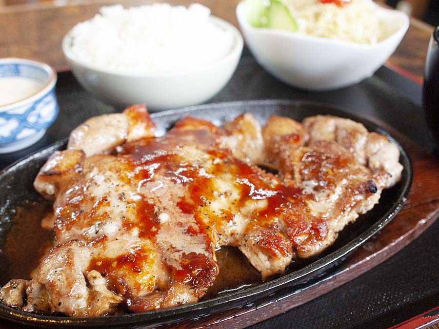 We recommend the "Pork Steak Set Meal," made with Hachimantai brand pork, "Tochu Tea Pork." The extra-thick cut of loin meat is brought to your table sizzling on a hot plate. It's a hearty dish that will stimulate your appetite with its sound!