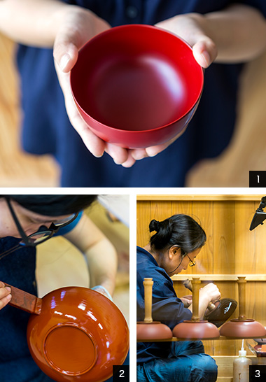 From start to finish, some 52 steps─preparing and blending pigments, coating a piece, drying it in a special chamber, polishing, repeat, repeat, etc.?are involved in crafting a single lacquered item. Bold colors and simple, timeless designs make Appi-nuri lacquerware well suited to contemporary tables, and with proper care each piece will remain beautiful for generations to come.