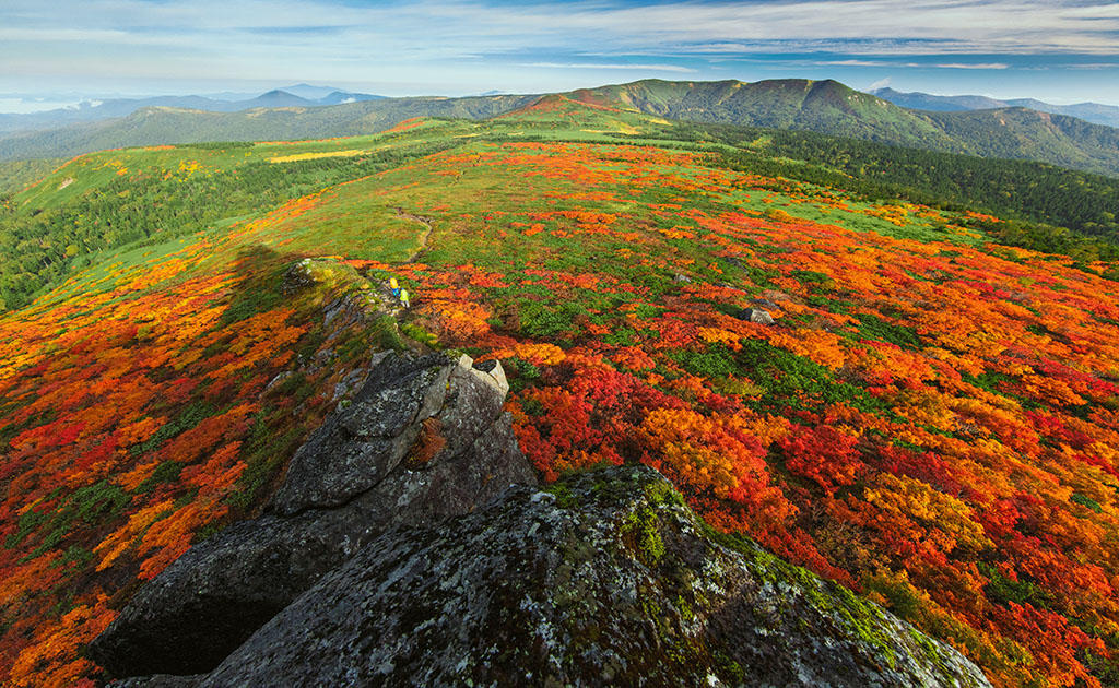 Mount Mitsuishi, at an elevation of 1,466 meters, is one of the most popular hikes in the region. The short alpine trees near the summit turn bright orange and red starting around September each year. This is one of the first places to enjoy the colors of autumn.