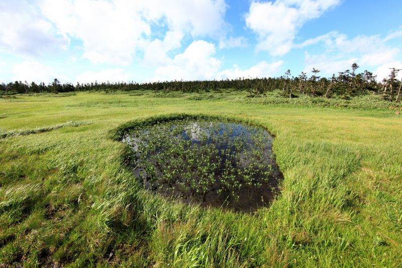 The distinctive deep dark-green forest forms Kuroyachi ("Black Wetland"), where Japanese white pines gather.