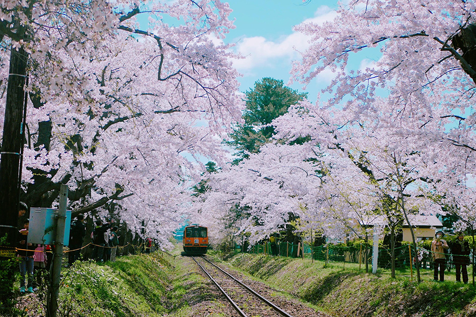 Ashino Park is located in the Kanagi district of Goshogawara, north of Hirosaki, and is also the birthplace of author Osamu Dazai. Along with Hirosaki Park, this park was selected as one of Japan's top 100 best places to view cherry blossoms. Approximately 2,200 cedar and cherry trees spread along the shores of Lake Ashino, and the Tsugaru Railway train passes through a tunnel of cherry blossoms as it crosses the park. Visitors are moved by this astonishingly beautiful and romantic scenery.