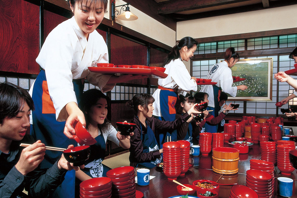 When eating wanko soba, small bite-sized portions of soba noodles are served in bowls by attendants standing nearby. If you visit Iwate, be sure to try it. It's great fun to see how many bowls you can eat, spurred on by the attendants' encouraging shouts.