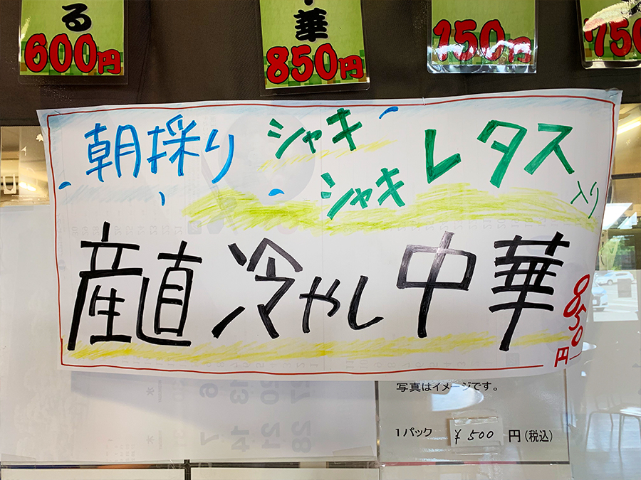 お勧めは、朝採りシャキシャキレタスが嬉しい「産直冷やし中華(季節限定)」。産直で仕入れている新鮮野菜がもりもり!レタスで麺が見えない位にサラダ感満載でヘルシー。