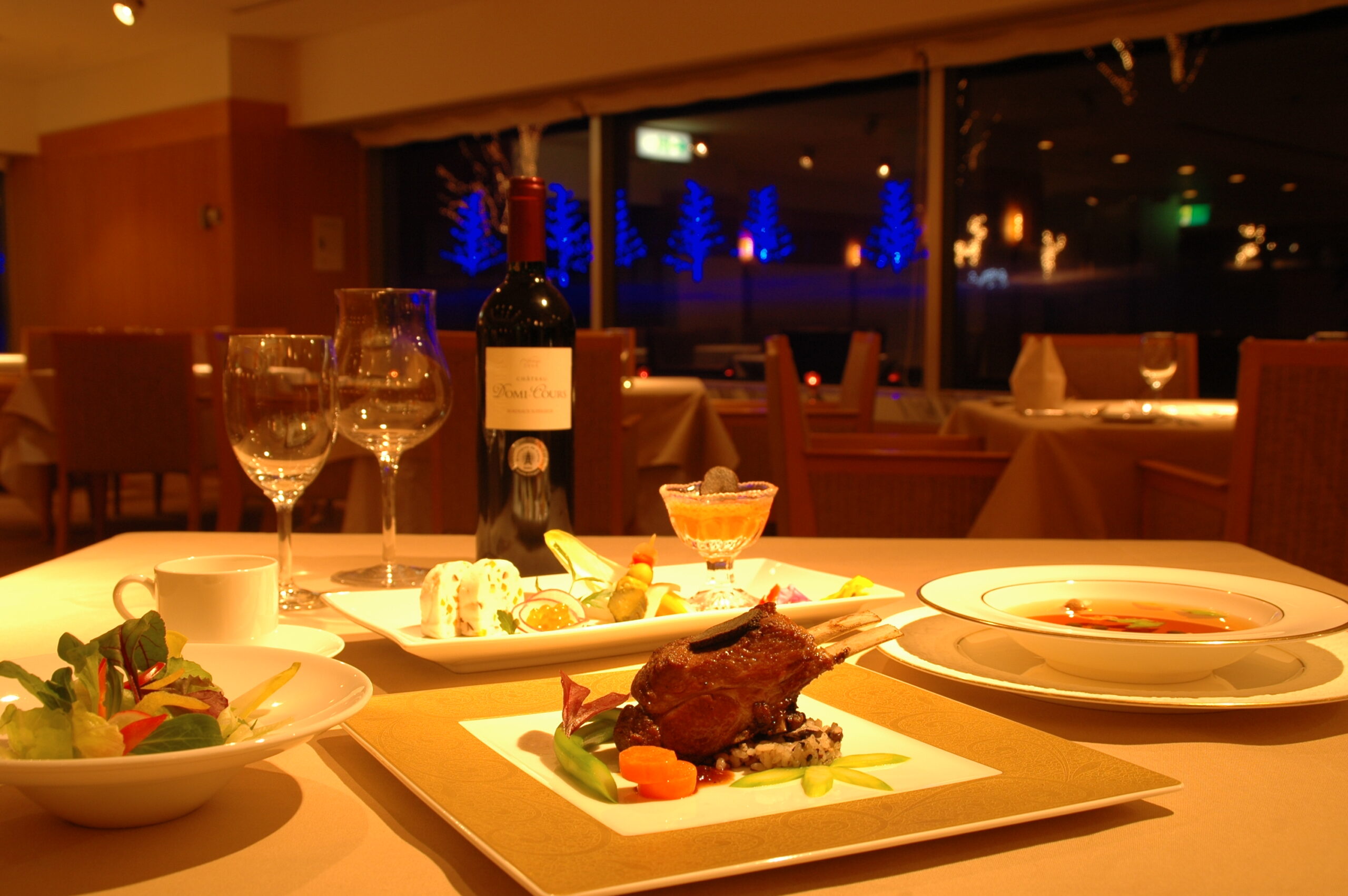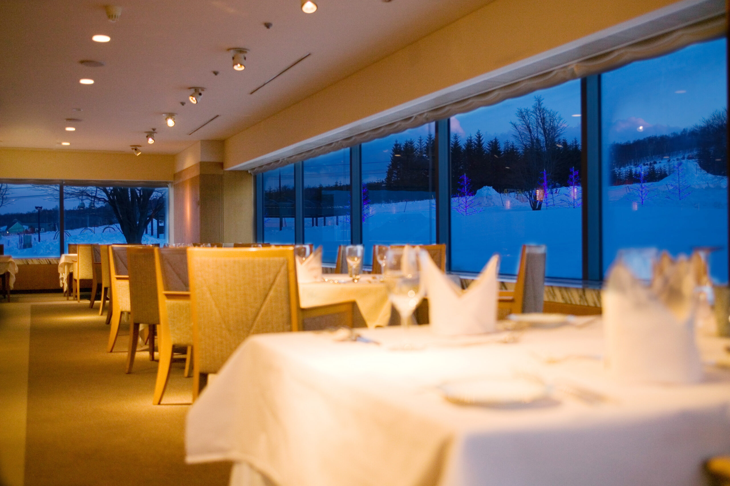 自然の四季を写すキャンバスのような大きな窓のある、落ち着いたレストラン。
