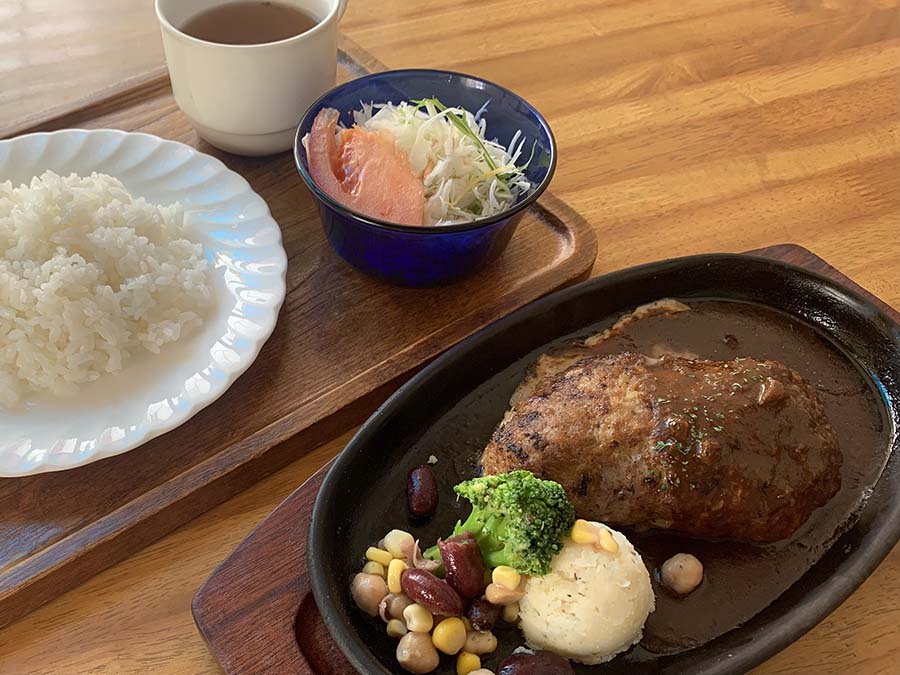 お勧めはレオスの定番メニュー「レオスハンバーグ」(ライス、スープ、サラダ付き)。肉の旨味がしっかりするジューシーなハンバーグで、ソースが選べるのもうれしい。自分好みのソースを見つけて、レオスのロングセラーを楽しんで!