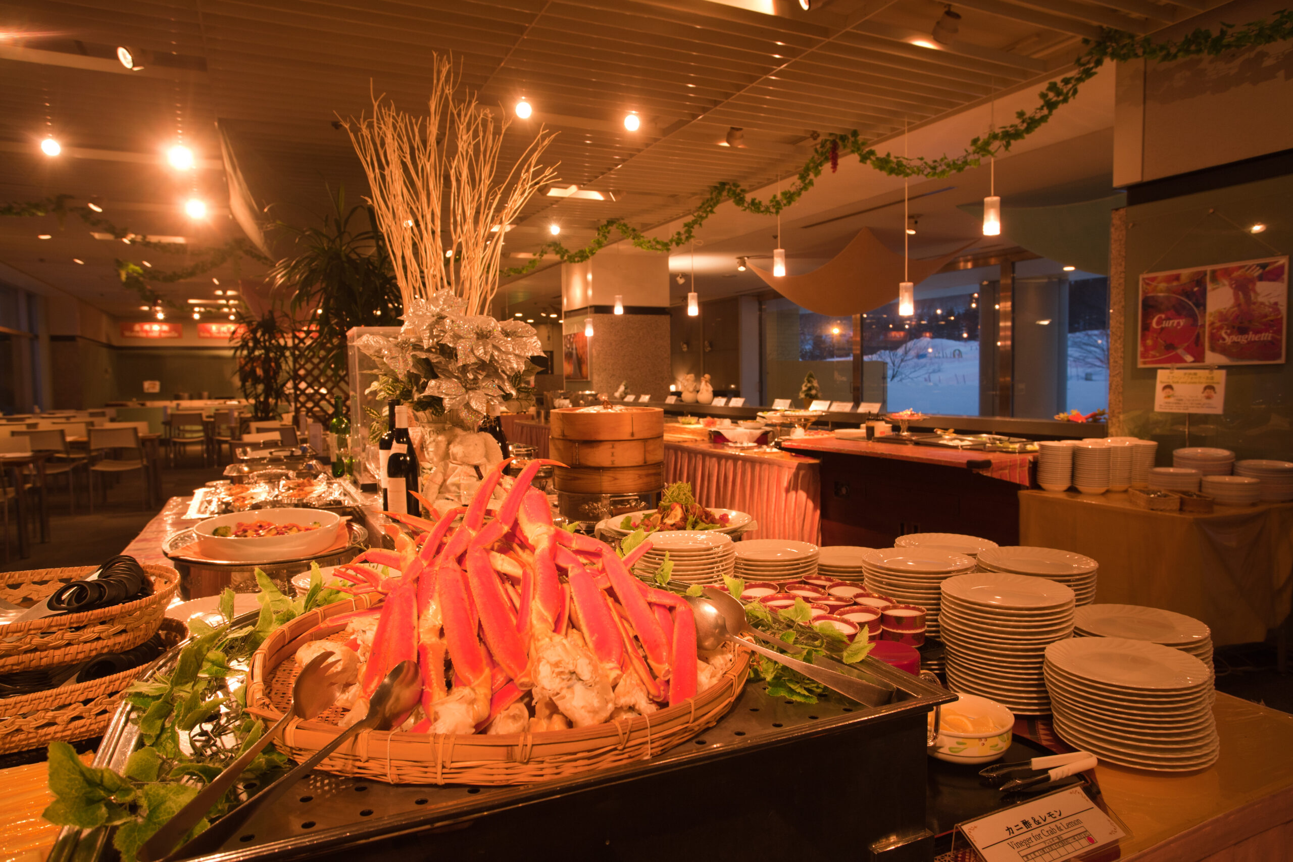 テラスレストラン「アルベルク」は、ゲレンデを望むオープンな雰囲気のカジュアルレストラン。常時80品以上取り揃えている料理は、季節に応じた食材をふんだんに使用。朝食バイキングで、一日の元気をチャージ!