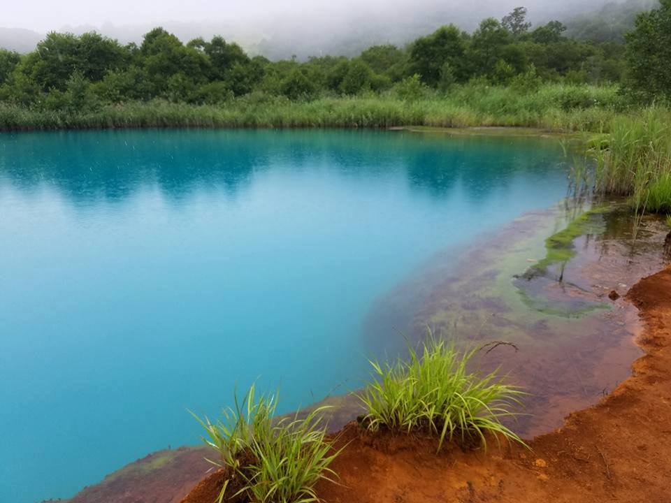 駐車場から短いトレイルが五色沼へと続いています。五色沼とは文字通り5色の池を意味します。火山の鉱物が湖に供給され、季節によって池の色が変わります。夏の暑さの中では、水は鮮やかな深い青色で、赤土の岸辺が際立って見えます。御在所沼は直接隣接しており、非常に美しいですが、隣の池のような色の変化はありません。両池の景色を提供する小さな展望台があり、訪問者はその違いを味わうことができます。