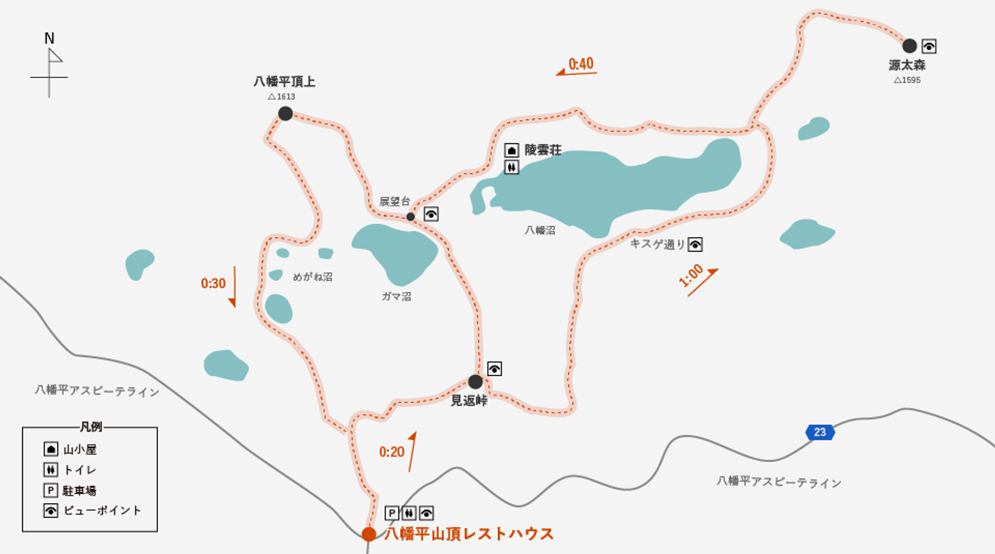 八幡平アスピーテラインの頂上近く、八幡平樹海ラインと交差するこの地点には、八幡沼と鏡沼を周回する美しい高山湿地を通る人気のトレイルがあります。 トレイルは非常に整備されており、湿地帯を通る木道があります。