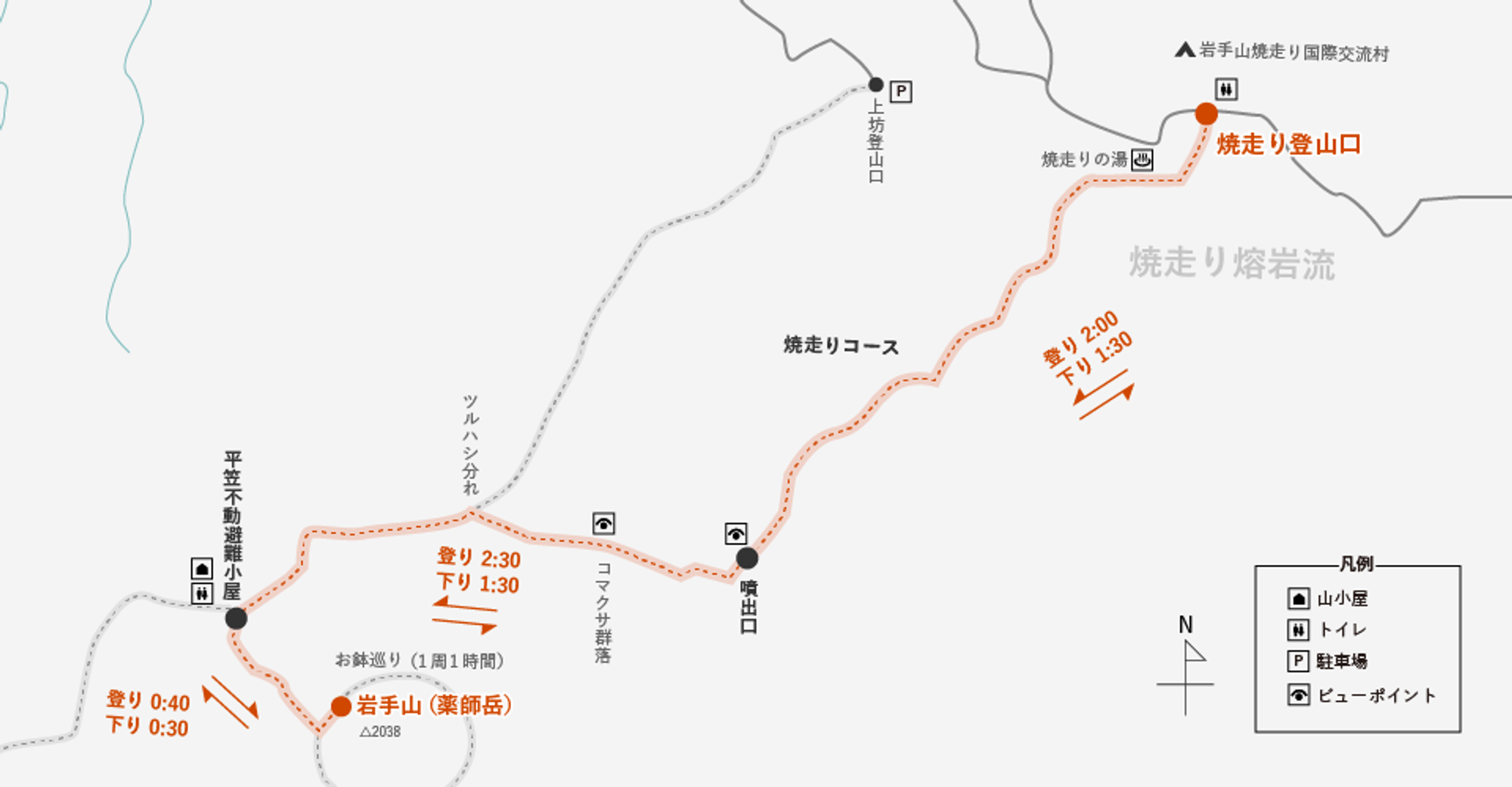 岩手山の上坊コースで最も困難な部分は、登山口を見つけることです。焼け走りの登山口からは短いドライブですが、曲がり角に小さなサインしかなく、伐採地を通る未舗装の道路を進む必要があります。その後、開始点を示す小さな山小屋と駐車場を見つけます。ハイキングは森林で始まり、最終的には焼走りのトレイルに合流します。基本的には、時間の少ない人や早めの登頂を好む人のための焼走りコースから数時間を短縮するショートカットです。(登山口にはトイレがないので、まず焼走りの休憩エリアで休憩することをお勧めします。)