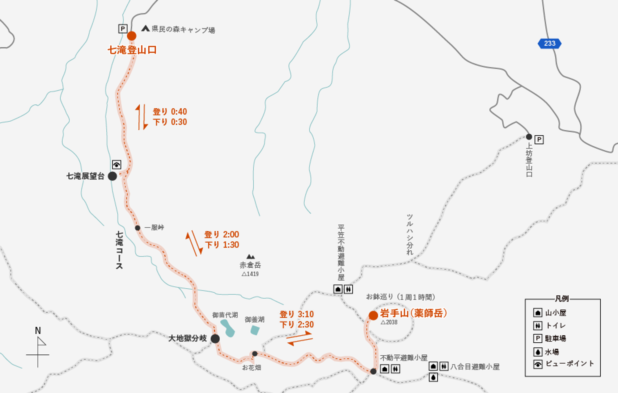 七滝コースは、岩手山の頂上への通常のトレイルの中で最も長いコースです。名前の意味は7つの滝で、トレイルの最初の部分では実際に美しい滝を数多く通過します。森を登りきった後は、硫黄ガスが地割れから噴出しているスリル満点の火山地帯を通過し、その後、高山の森に入り、最後には頂上周辺の荒涼とした火山地帯へと姿を現します。これはやや難易度が高いですが、非常に達成感のあるハイキングで、経験豊富なハイカーに推奨されます(そしてこのハイカーのお気に入り)。地図を持参するか、少なくとも事前に地図をチェックしてください。道中にはいくつかの分岐点があります。