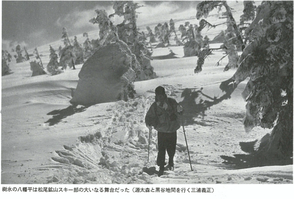 松尾鉱山にスキーが入ってきたのは大正10(1921)年頃。樹氷に彩られた八幡平での練習風景(画像提供:松尾鉱山資料館)
